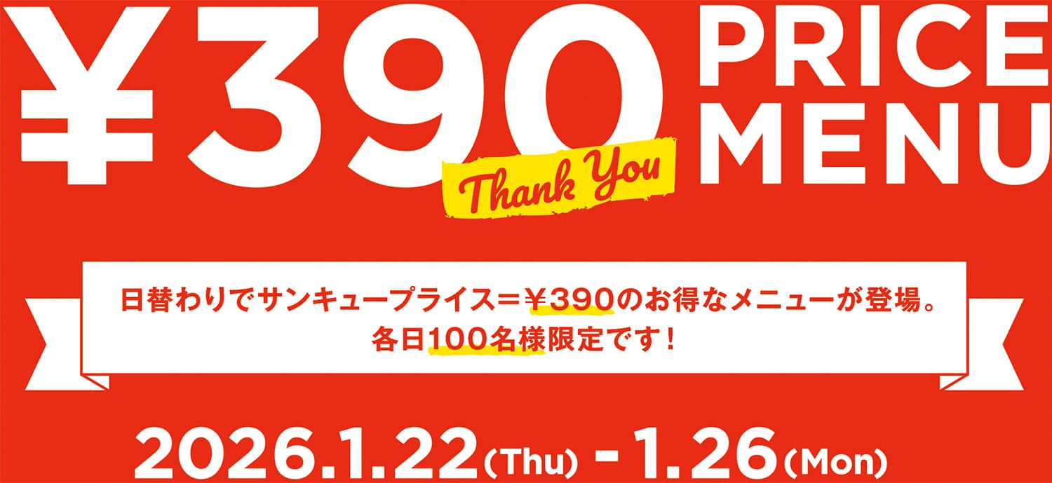 eat in/ ¥880(税込)、take out/ ¥864(税込) → ¥390(税込)