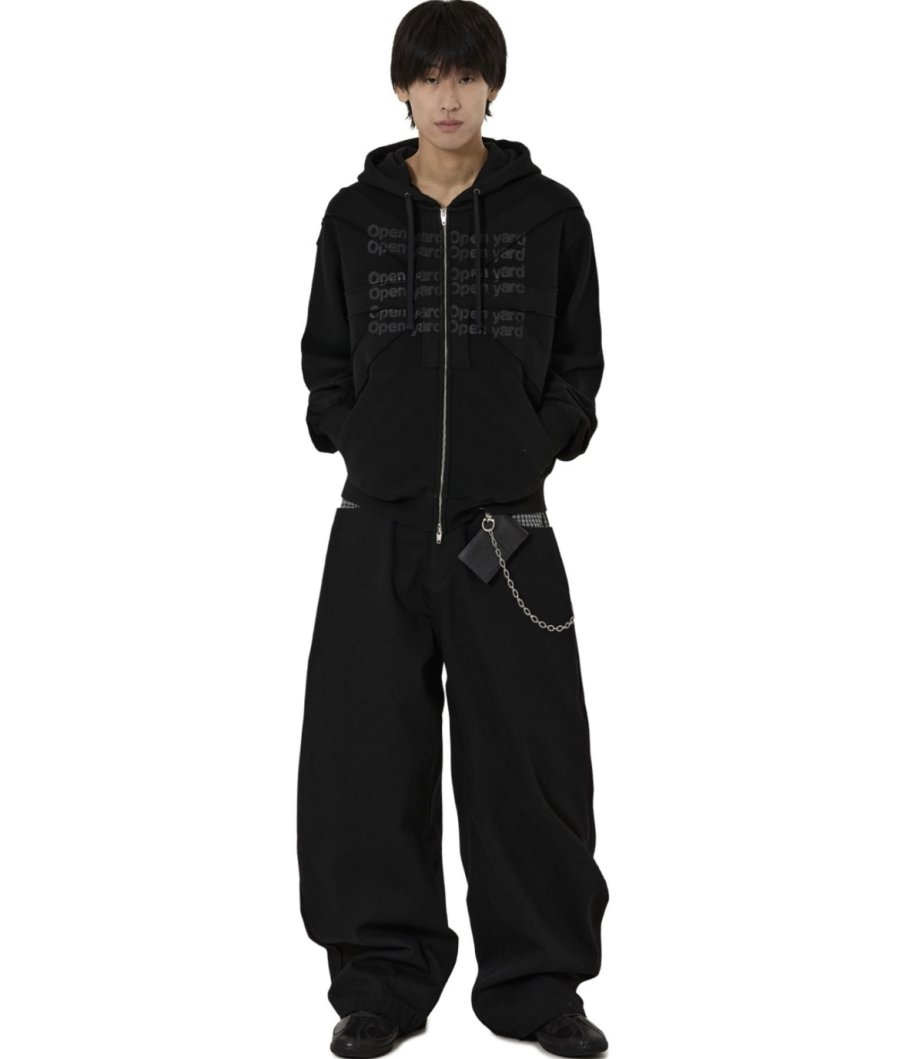 フロント全体に大胆なカットアウトとパッチを組み合わせたデザインが特徴のジップアップフーディで、シンプルなコーディネートの主役に。