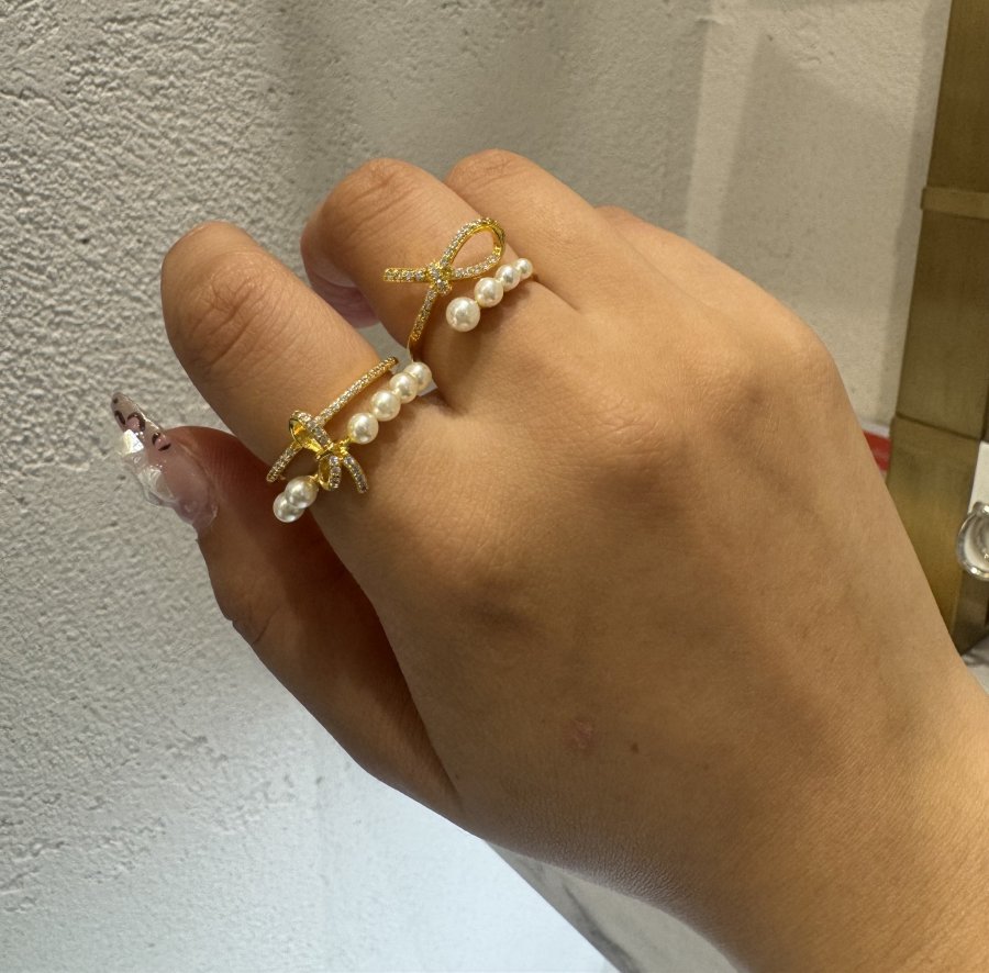 上品な艶めきのパールと繊細なリボンを合わせた2連風リング
