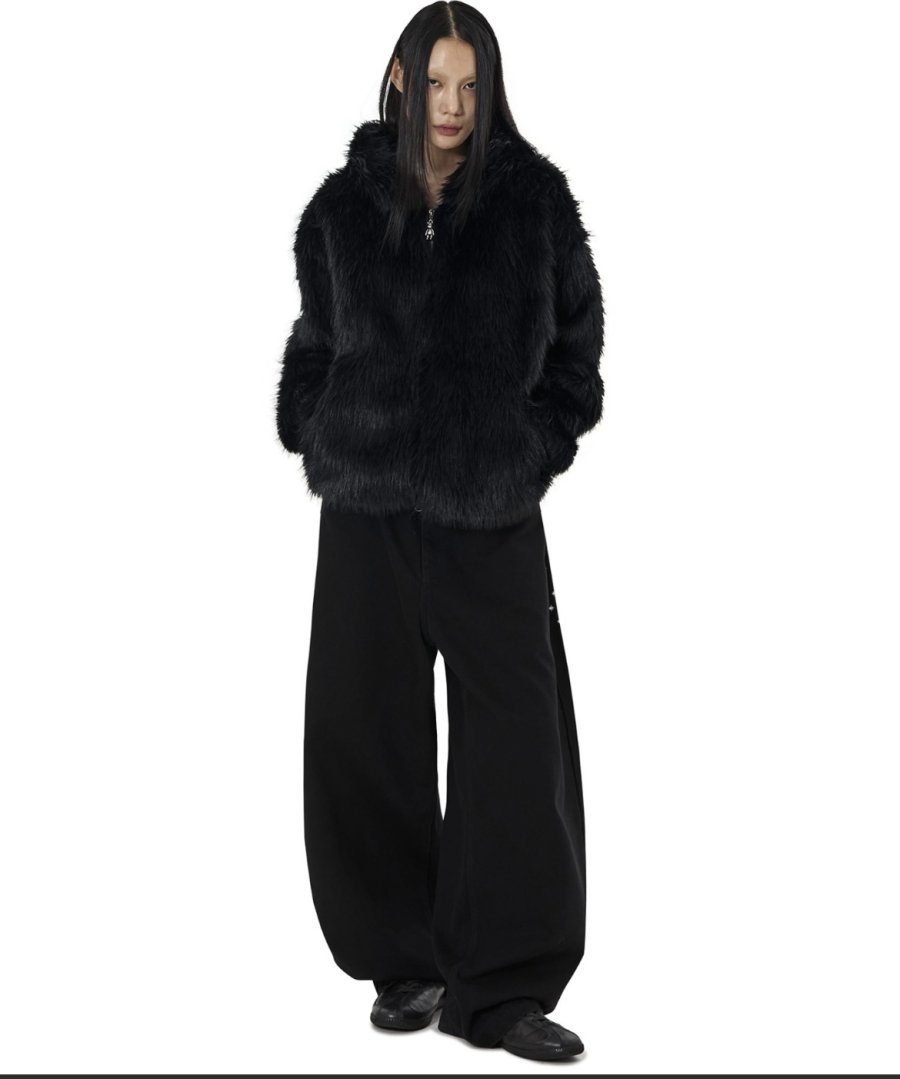 ファーが全体を包み込む、存在感のあるフーディージャケットです。