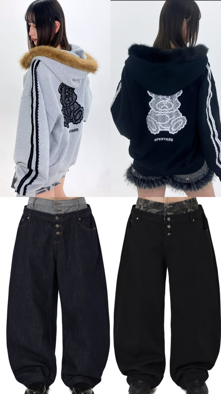 新しく発売されたファーのついたドリーフーディーにレイヤードのパンツを合わせたコーデとなっています!