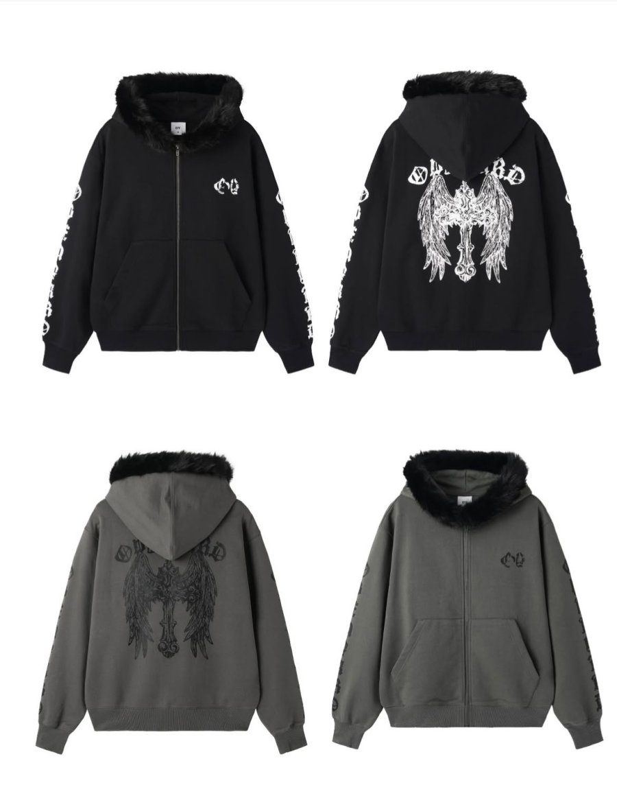 ファーのついたフーディーに大きめのパンツを合わせたコーデ。