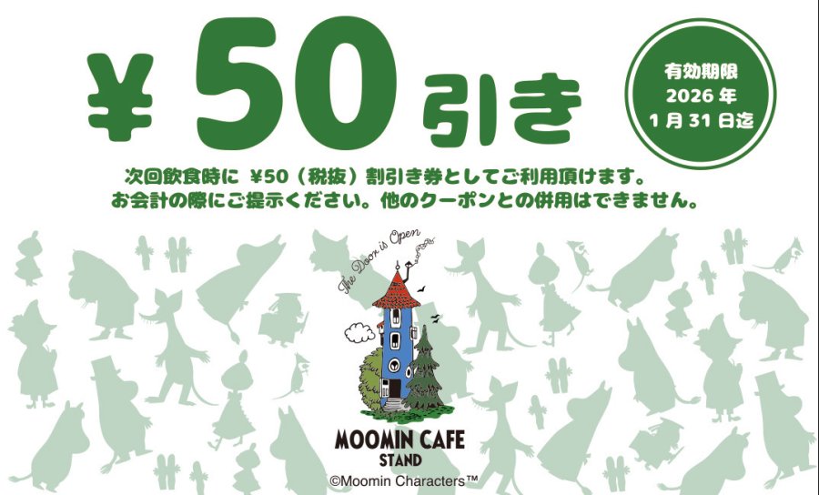 MOOMIN CAFE STANDでは只今お会計の際に、次回飲食時で