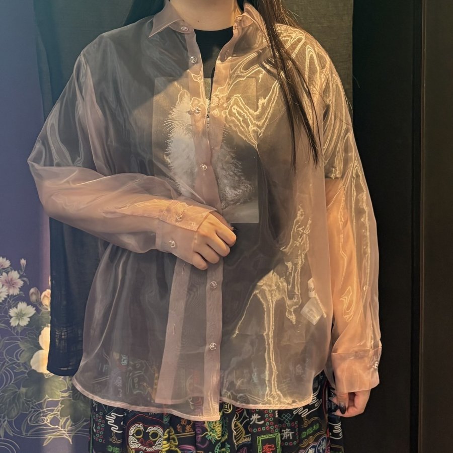 &ellecyでは透け感が涼しげなシアーシャツが販売中です!絶妙な透け感とキラキラがとっても素敵なシャツ。