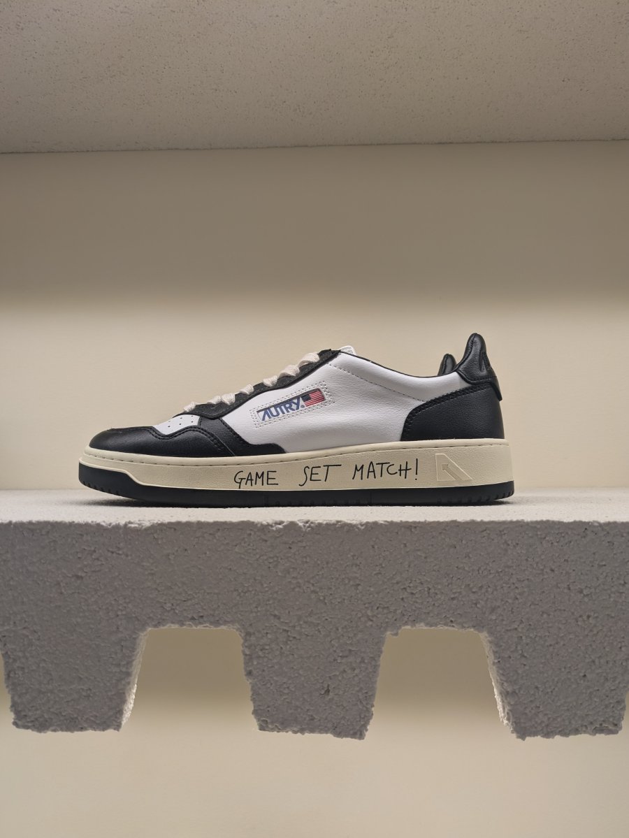 ソール部分にメッセージをプリントした、バイカラーで仕上げられたローカットスタイルの「メダリスト」モデル。