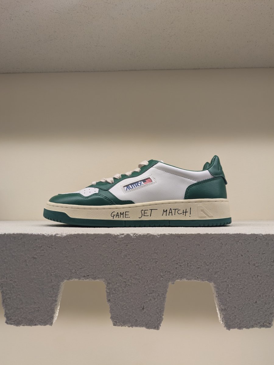 クラシックなテニスシューズをモチーフにデザインされたレザースニーカーです。2色のカラーコンビネーションで印象的なデザインに仕上げ、ソール部分にはメッセージワードをプリントしたモデルです。上質で柔らかなカーフのスムースレザーを使い丁寧に仕上げる事でラグジュアリーな履き心地を作り上げています。インソールには肉厚なEVAソールが使われ、フィット感と履き心地を高めています。アウトソールにはフラットソールを採用、こちらもバイカラーで仕上げています。シューレースとアウトソールはライトベージュがチョイスされ、程良いビンテージ感を演出しています。シューズの内側部分にはパイル素材を使用し、吸湿性の良さと肌当たりの良さを作り上げています。サイド部分には星条旗を湛えたロゴマークが配されデザインのアクセントとなっています。