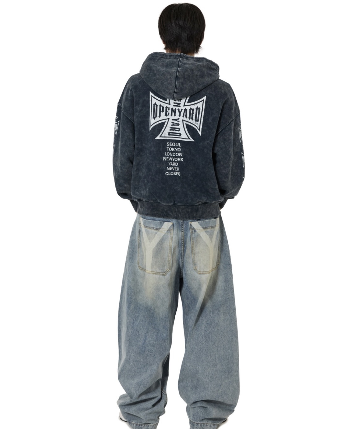 スプレー加工が施され、背面のベアが存在感を放つジップアップフーディー。