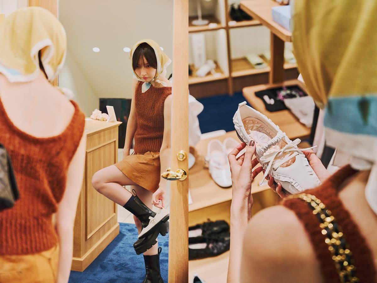 女の子なら一度は憧れる、バレリーナのような凛とした佇まい。ふたりとも“トレンド感のあるデザインで、今っぽく履ける!”と太鼓判を押す〈Rockfish Weatherwear〉のアイテムは、定番となりつつあるバレエコアファッションにはもちろんのこと、普段のスタイルに忍ばせれば、ぐっとエレガントな雰囲気に仕上がります。お気に入りの一足が見つかり、ご満悦なふたり。